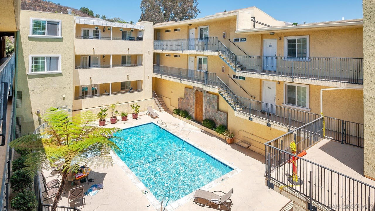Beautifully upgraded 2BR/2BA condo located just walking distance to SDSU in the desirable 'Collwood Point’ complex with 2 reserved parking stalls! Remodeled kitchen features all stainless-steel appliances & granite slab countertops w/ cherry wood cabinetry, opening up directly to the spacious living room & dining nook. Interior upgrades include recessed lighting throughout the main living areas, upgraded baseboards, ceiling fans in each BR, upgraded bathrooms w/ matching granite & cherry wood vanities & tile shower, 'in-unit' stackable washer/ dryer for convenience, fresh interior paint, newer wall unit AC's/ air conditioning units for cooling & more! Upper, corner unit in a quiet & central location w/ only 1 shared wall. Secure building & gated complex w/ elevator, GATED parking within complex & both parking stalls sit just downstairs from the unit! Complex amenities include Pool/ Spa, fitness center & community BBQ. Walking or biking distance of only . 8 miles to SDSU w/ easy access to freeway & nearby public transportation. Great investment. Fantastic location! Complex is perfect for a rental, student residence & / or owner occupant. Low monthly HOA fee includes water & trash + the HOA is currently redoing the entire complex w/ new roofing.